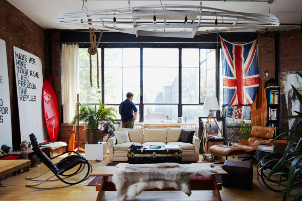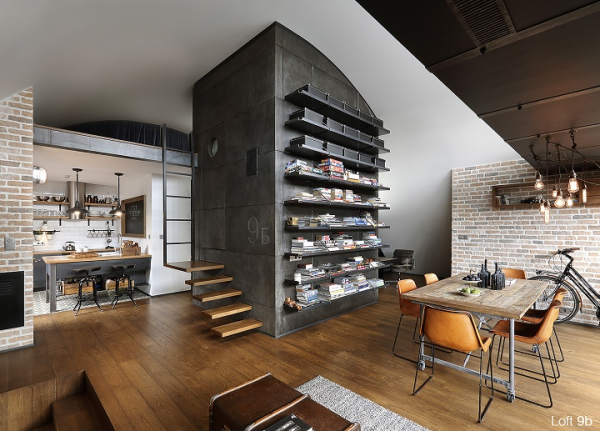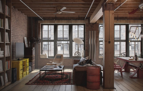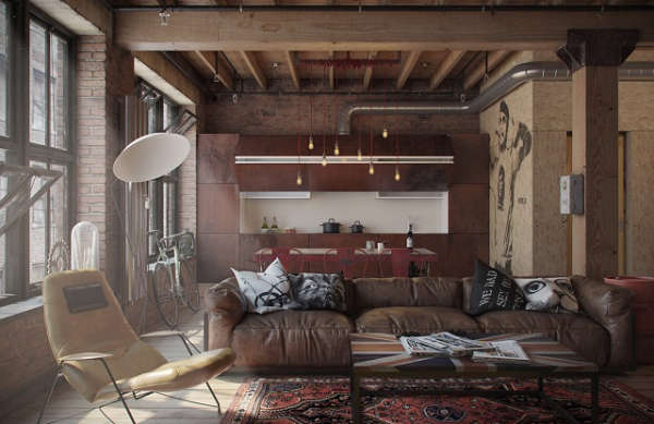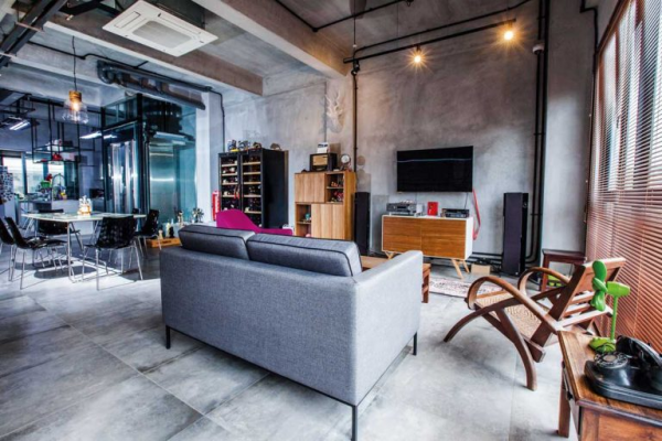 Interior yang maskulin dengan sentuhan semen eksposnya.