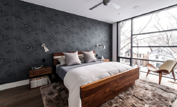 Kamar yang maskulin dengan motif wallpaper yang keren dan tempat tidur kayu rustik yang tampak macho.