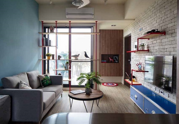 Interior ruang tamu yang maskulin dengan sentuhan dinding bata ekspos.
