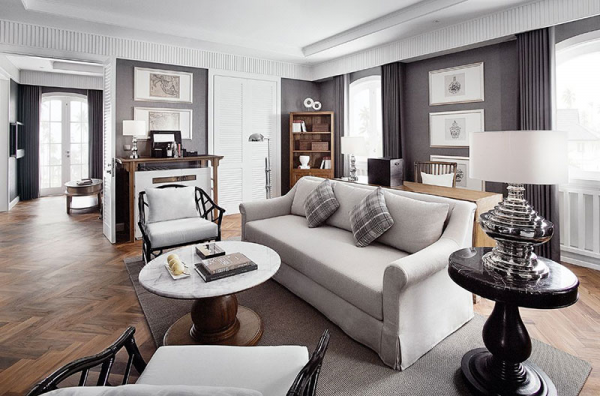 Interior ruang tamu british colonial dengan warna yang kalem.