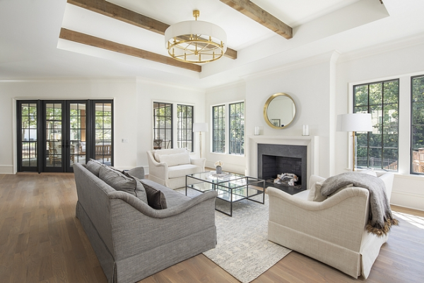 Ruang keluarga dalam desain country sebaiknya mengundang interaksi dan percakapan. Pilih furnitur yang nyaman dan tata ruang yang mengarah ke pusat perhatian, seperti perapian batu.