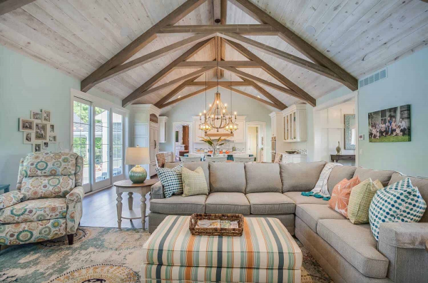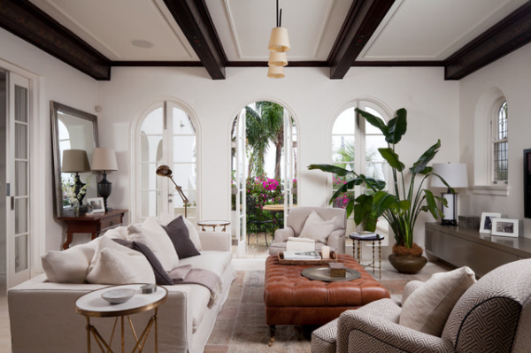 Interior ruang tamu plantation minimalis dengan alas lantai trandisionalnya yang hangat.