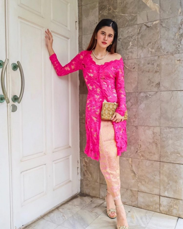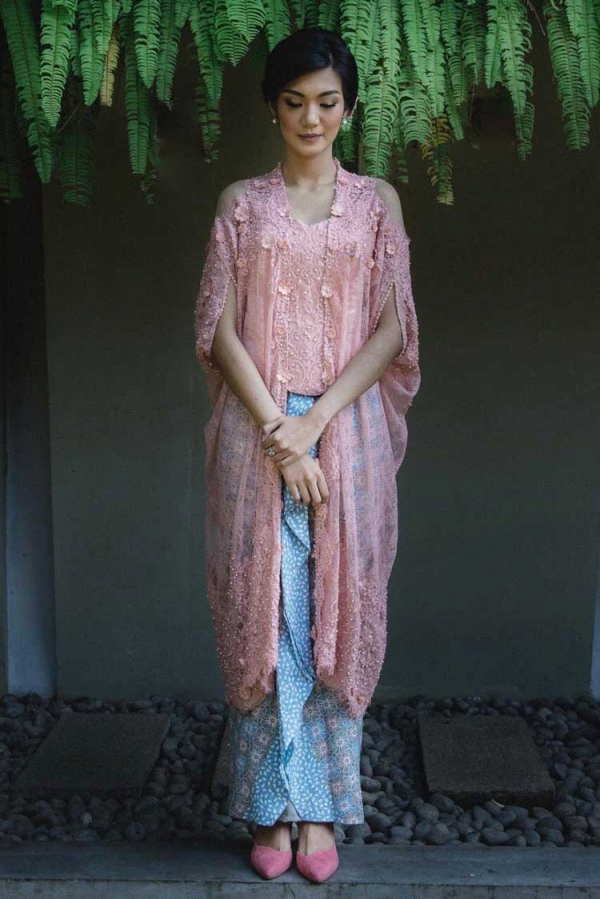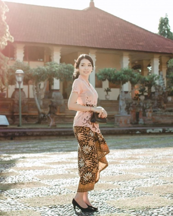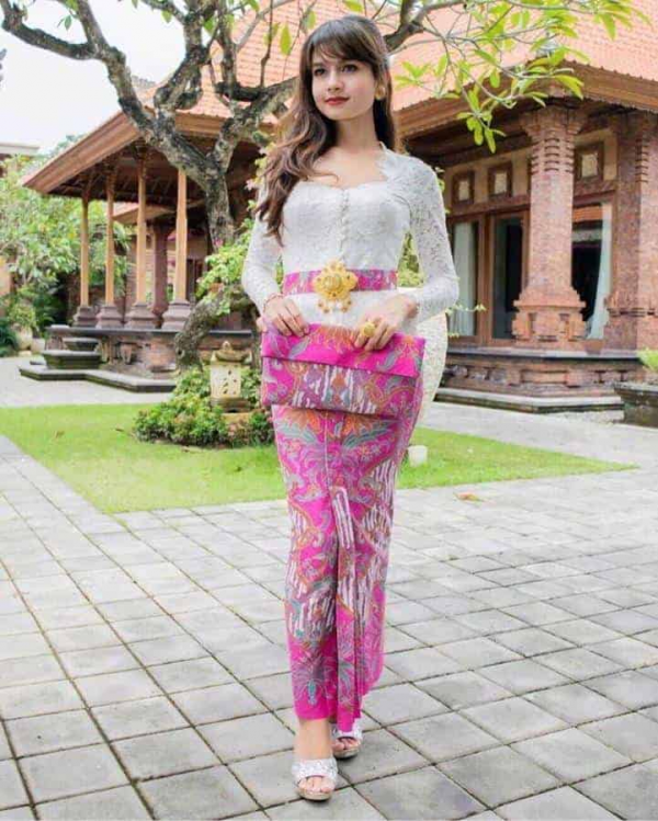 Kebaya Bali modern dengan warna merah muda yang menawan.