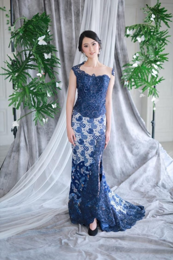 Warna biru yang dikombinasikan dengan bawahan batik.