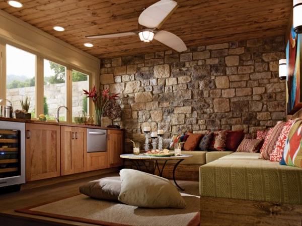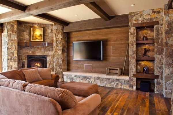 Ruang tamu dengan kombinasi batu alami dan kayu yang menarik.