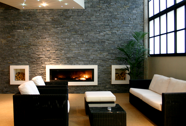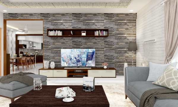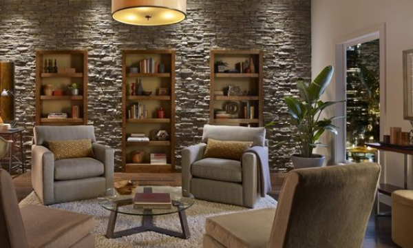 Interior ruang tamu dengan sentuhan batu alami yang menarik.