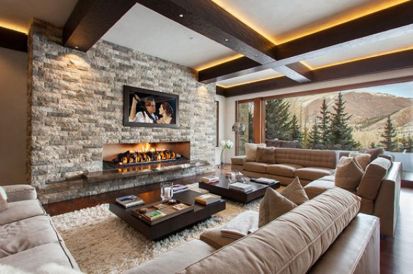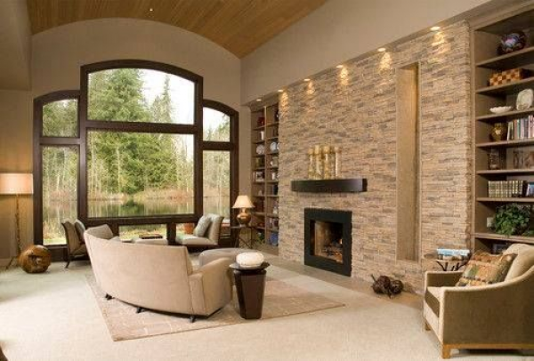 Jika ruang tamu Anda memiliki perapian, desainlah dengan mantel dan dinding dari batu alami. Ini akan memberikan nuansa klasik dan elegan, serta menciptakan fokus visual yang menarik.