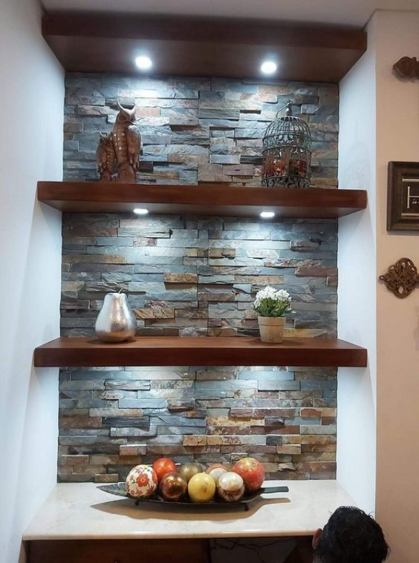 Buat rak dinding atau lemari dengan lapisan batu alami sebagai hiasan. Ini bisa digunakan untuk menampilkan barang-barang dekoratif atau buku-buku.