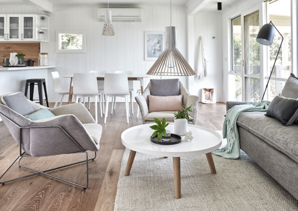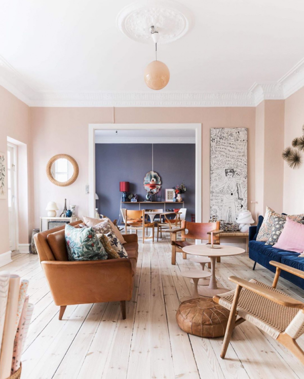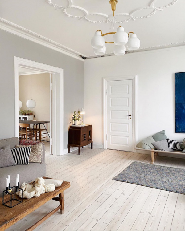Interior ruan tamu Danish dengan sentuhan rustik yang menarik.