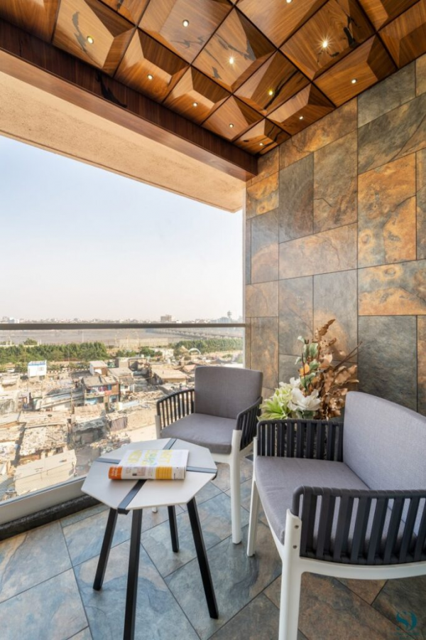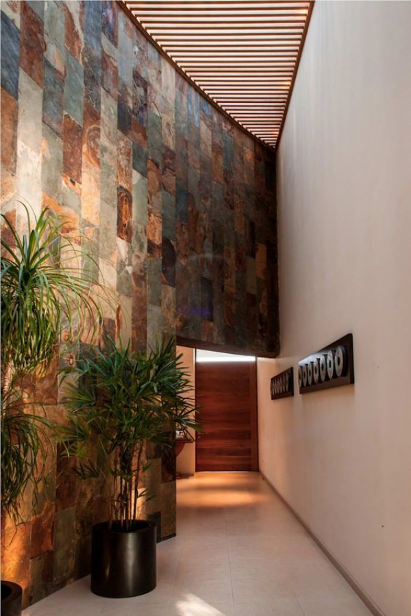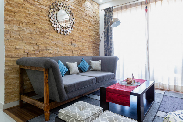 Interior ruang tamu dengan dinding ubin yang cantik.