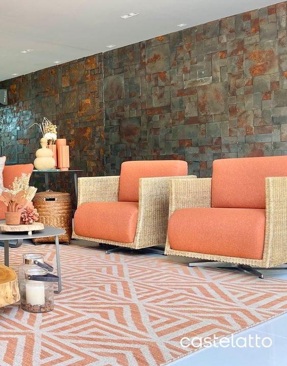 Ruang tamu dengan dinding ubin keramik yang menarik.
