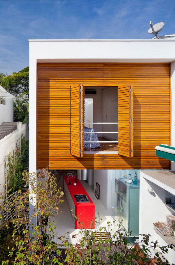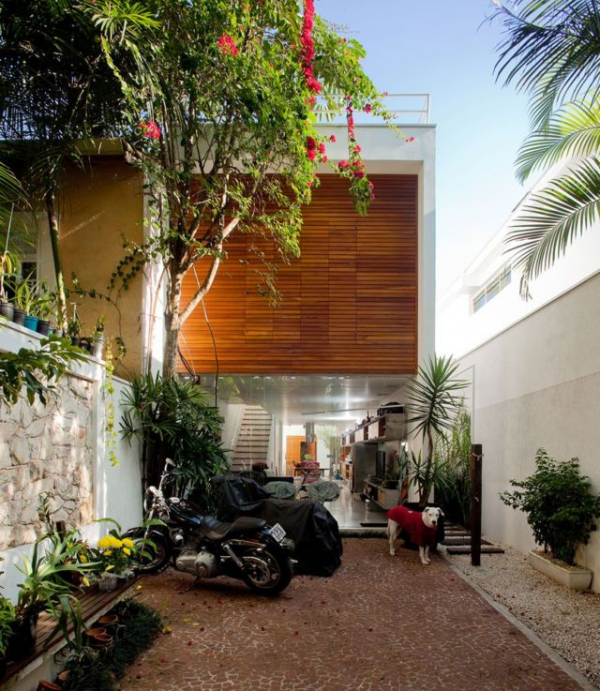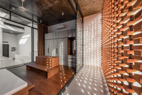 Rumah dilahan terbatas dengan dinding roster sebagai penyaring cahaya.