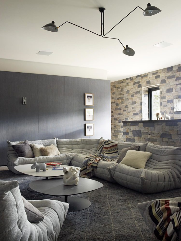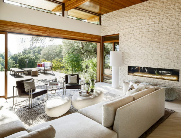 Interior ruang tamu organik modern yang hangat dengan sentuhan dinding batu alam yang eksotis.