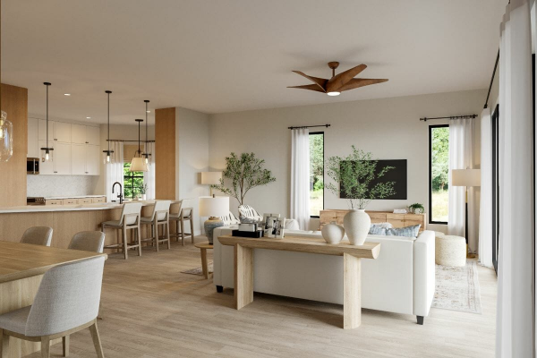 Gunakan konsep desain terbuka untuk menciptakan aliran yang lancar antara ruang tamu, dapur, dan area lainnya. Ini akan menciptakan suasana yang lapang dan nyaman.