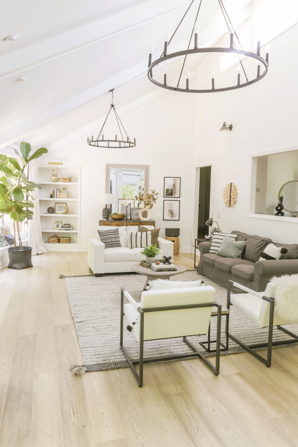 Interior ruang tamu organik modern dengan lampu hias gantung yang cantik.