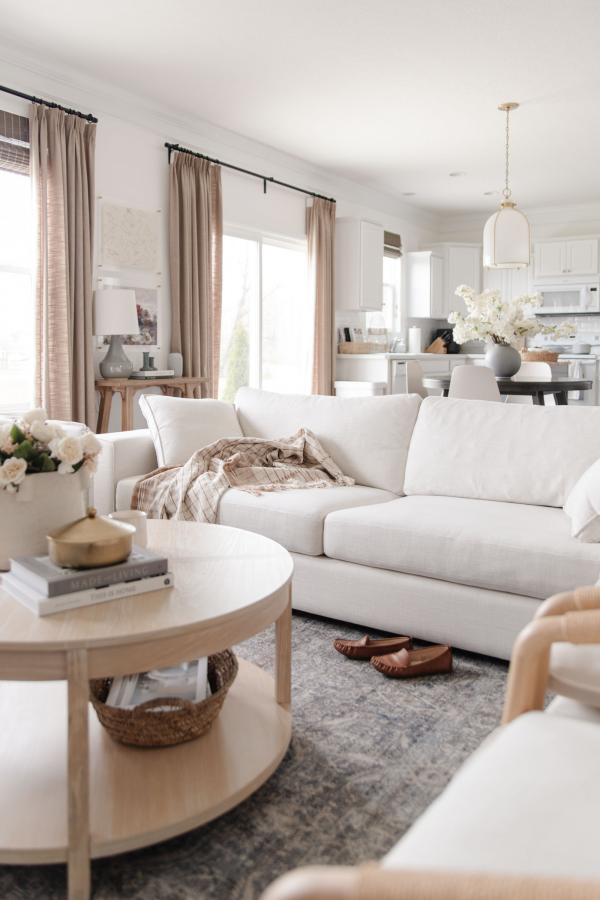 Interior ruang tamu organik modern yang hangat.