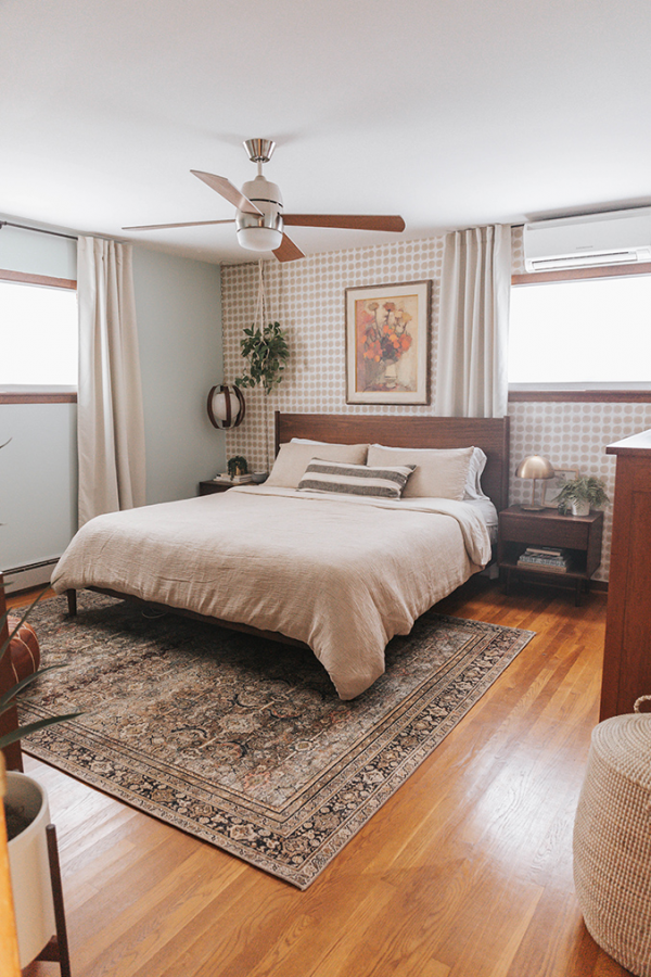 Interior kamar eklektik dengan aksen kayu yang cantik.