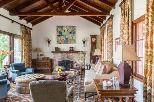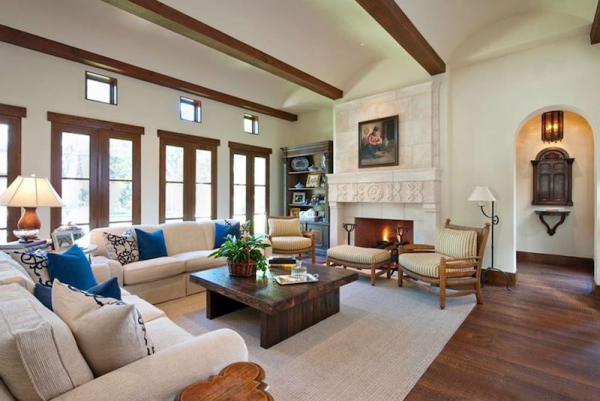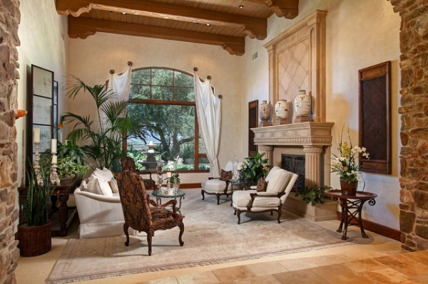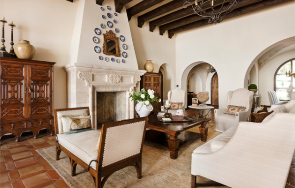 Interior ruang tamu rumah mediterania ala Spanyol.