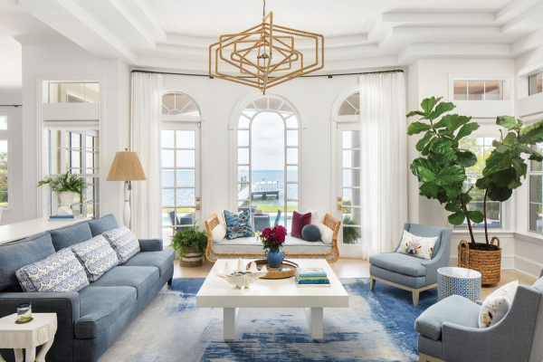 Interior ruang tamu rumah mediterania dengan jendela yang banyak.