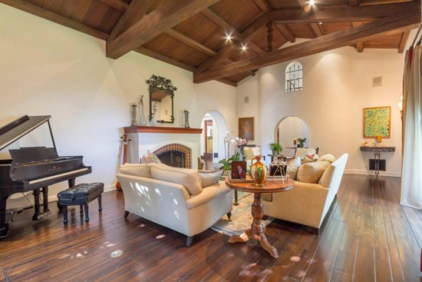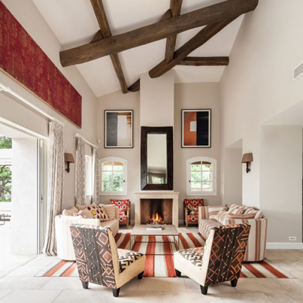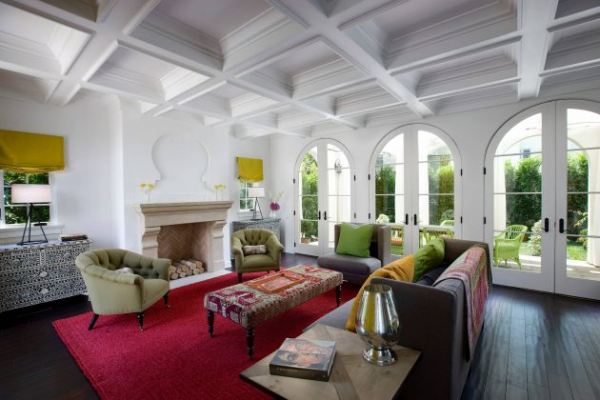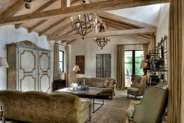 Interior ruang tamu rumah mediterania dengan plafon yang keren ya.