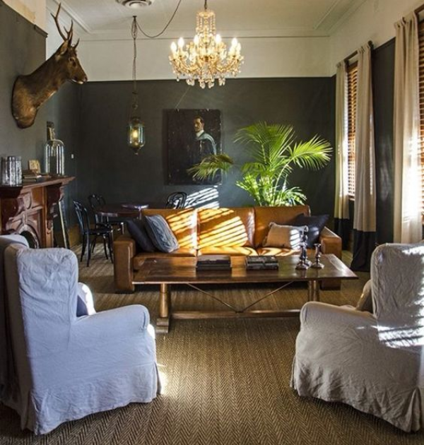 Kepala rusa dan lukisan kuno jadi hiasan dinding yang cantik.