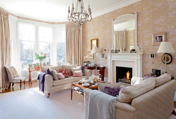 Interior ruang tamu gaya edwardian dengan wallpaper motif bunga nya yang cantik.