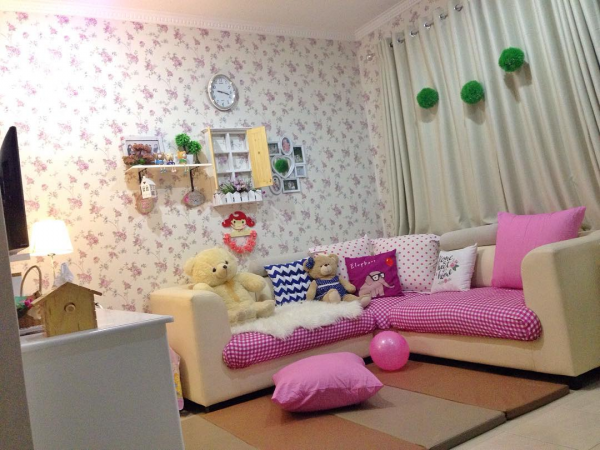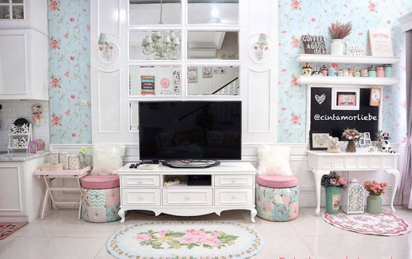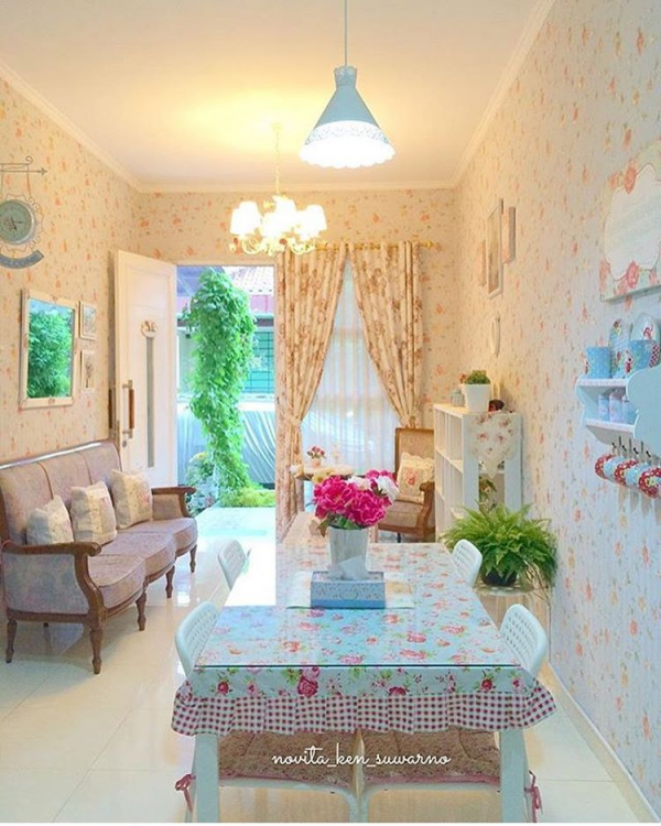 Interior ruang keluarga shabby chic dengan wallpaper nya yang cantik.