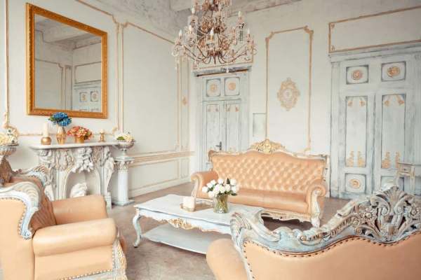 Gaya shabby chic sering menampilkan furnitur kayu seperti kursi, meja, atau rak buku yang dicat dengan warna gelap atau tertumpuk dengan furnitur lama lainnya.