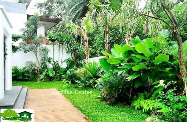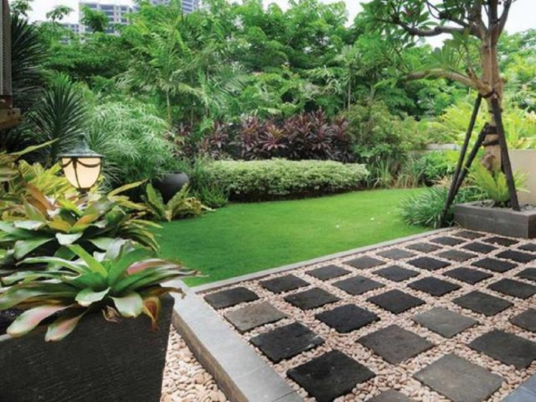 Gunakanlah kayu atau batu dengan ukuran yang sesuai dengan desain taman anda. Jangan lupa untuk memberikan finishing touch dengan menambahkan pot-pot atau vase berisi bunga tropis ke dalam taman anda.