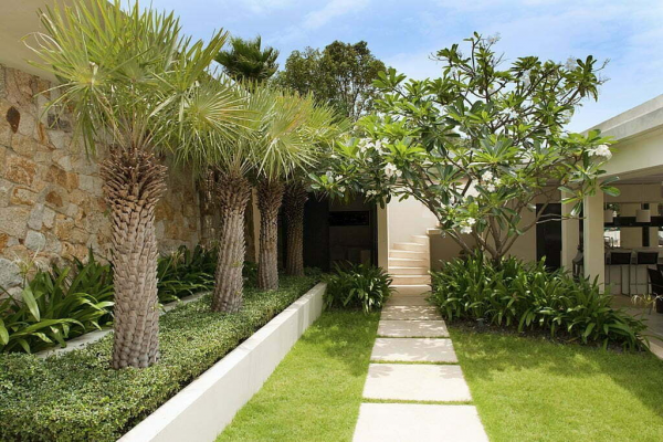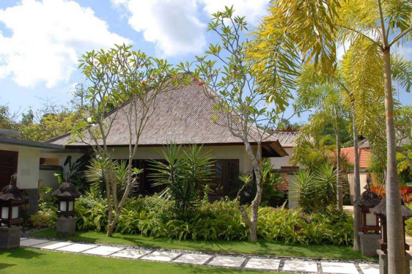 Taman ala Bali dengan bunga kamboja dan aneka pohon palm yang menarik.