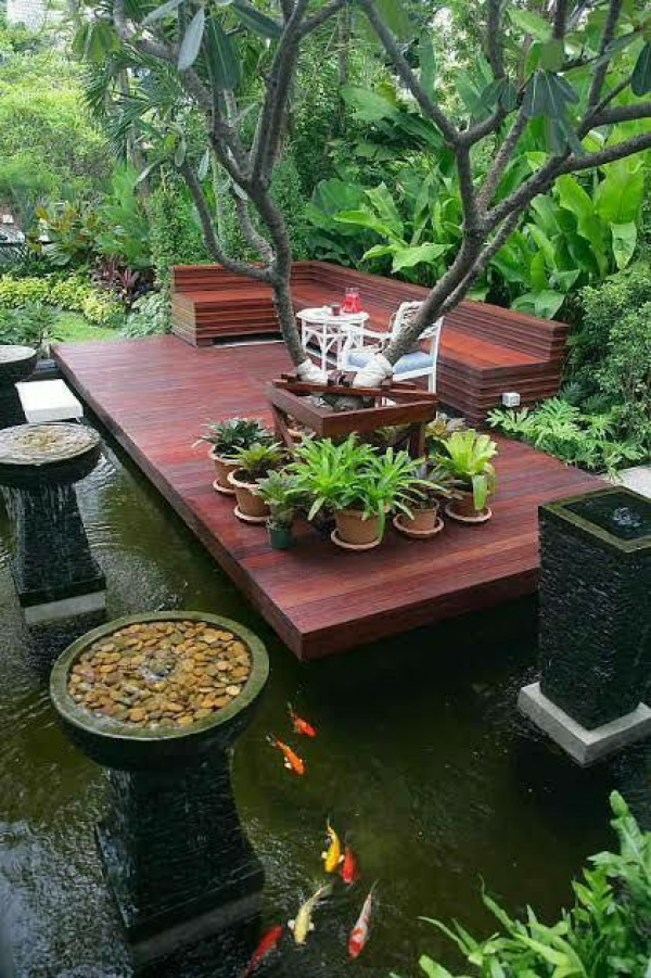 Taman nuansa Bali dengan kolam dan tempat santai diatas nya.
