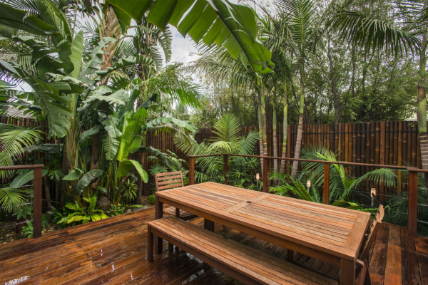 Taman belakang rumah nuansa Bali dengan kursi dan meja nya yang cantik.