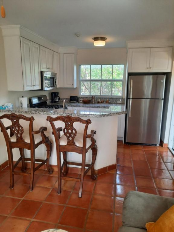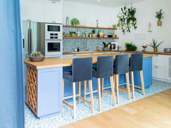Dapur rumah mediterania dengan kombinasi warna yang cantik bukan.