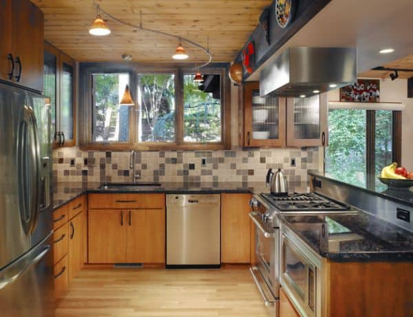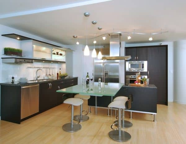 Pencahayaan dapur dengan lampu gantung dan sorotnya.