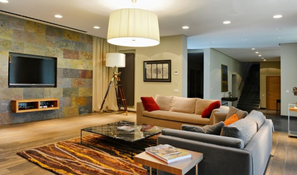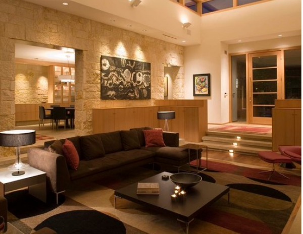 Pencahayaan ruang keluarga dengan pancaran lampu led pada plafon.