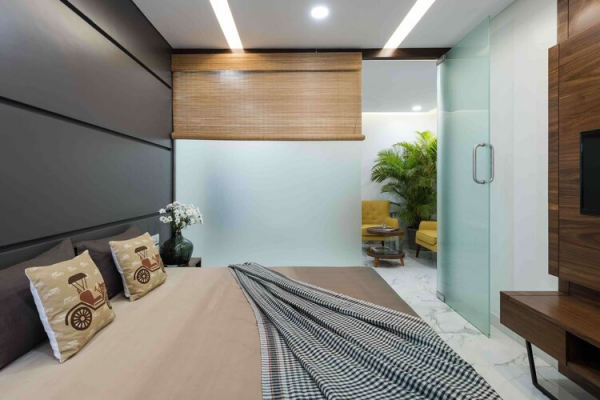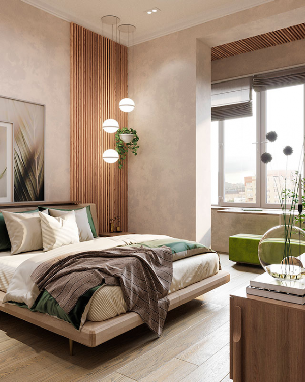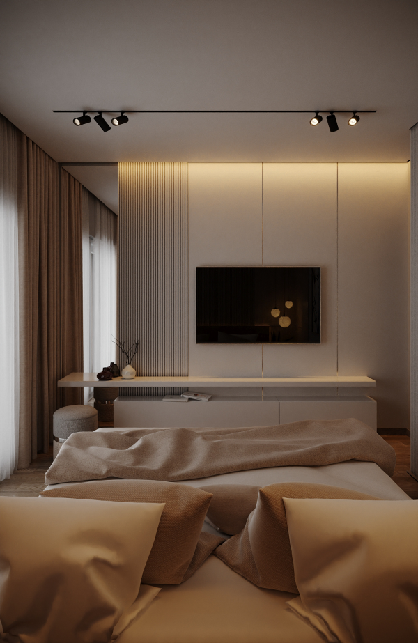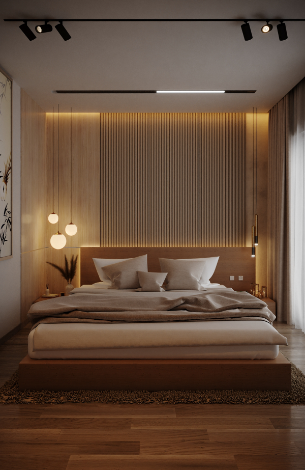 Pencahayaan interior kamar dengan kombinasi lampu yang cantik.