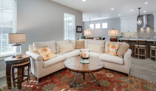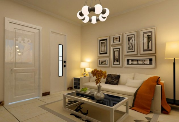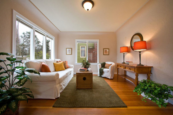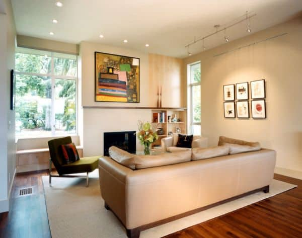 Kombinasi cahaya alami dan lampu untuk ruang tamu minimalis yang cantik.