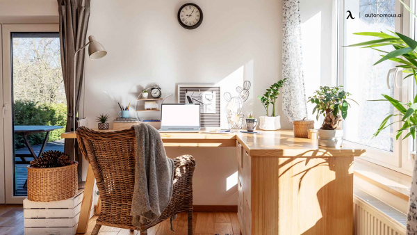 Ruang kerja yang hangat dengan kombinasi pencahayaan alami dan lampu yang menarik.