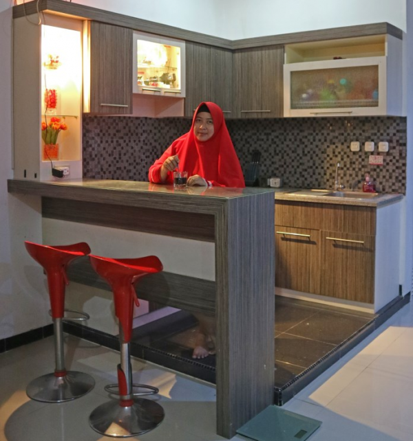 Dapur mini bar dengan sentuhan batu bata merah eksposnya.
