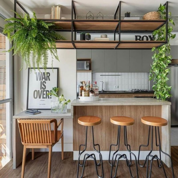 Dapur mini bar cantik dengan meja yang menempel di dinding.