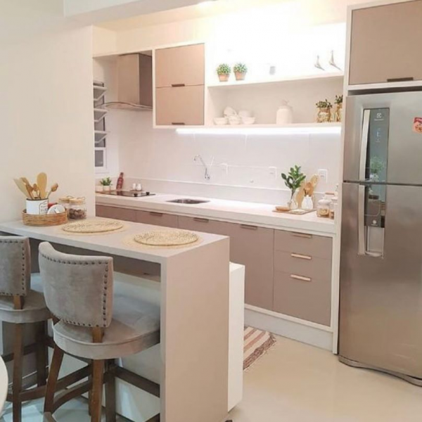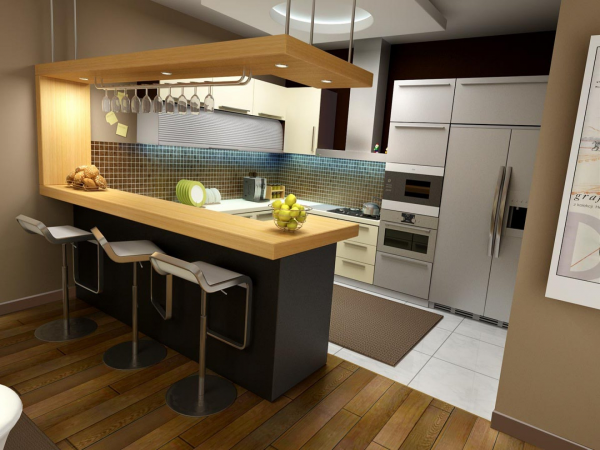Dapur dengan mini bar merupakan dapur dengan pemisah kayu (counter) kecil tempat makan dan minum yang menyatu dengan area dapur, biasanya counter tersebut memiliki beberapa kursi kecil dengan ketinggian yang diatur sedemikian rupa agar terlihat cantik dan menarik.