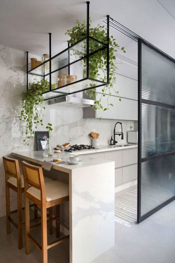 Dapur mini bar dengan partisi transparan yang cantik ya.