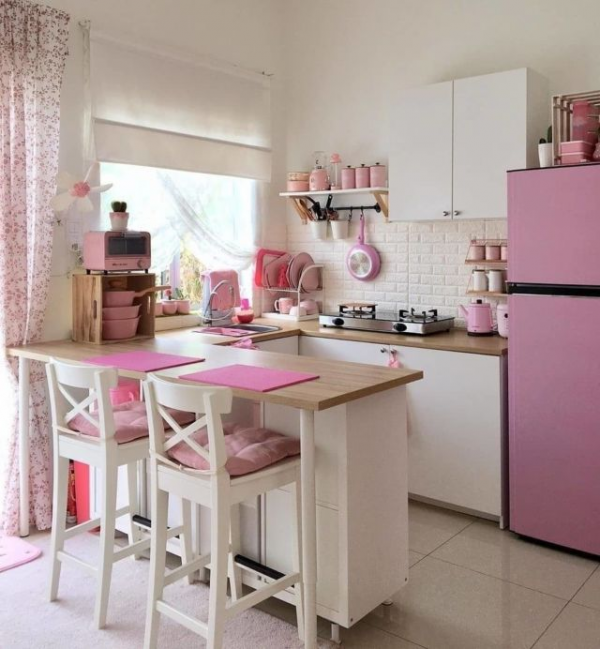 Dapur mini bar dengan nuansa pink yang cantik.