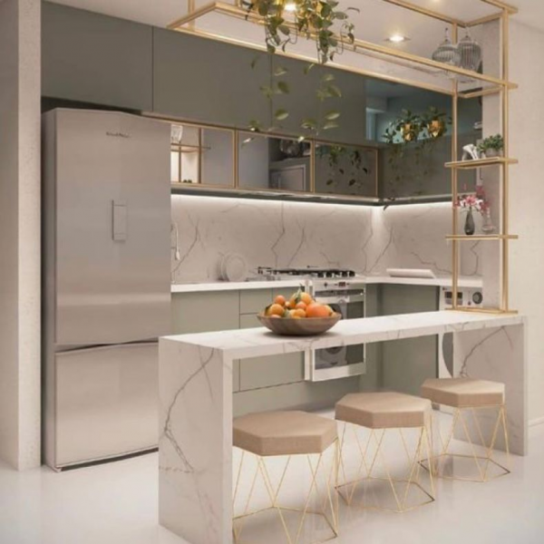 Dapur mini bar dengan motif marmer yang cantik.