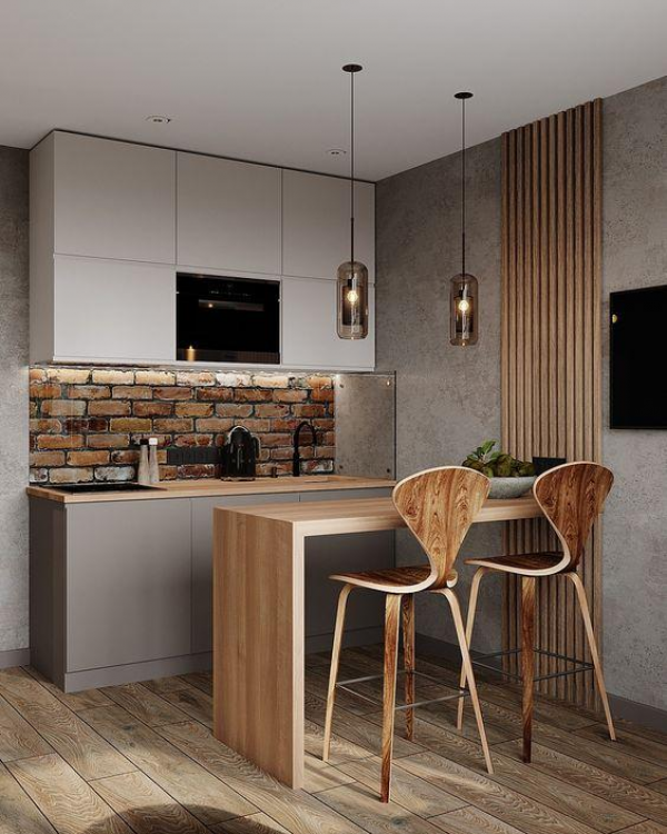 Suka dengan motif kayu dapur mini barnya.