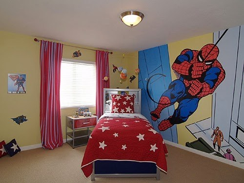 Seperti yang sudah kita bahas di atas, biasanya kamar anak laki-laki di penuhi oleh berbagai macam karakter superhero favoritnya. salah satu karakter favorit anak-anak adalah spider-man yang bisa dijadikan wallpaper atau sekedar poster yang bisa ditempel di dinding kamar anak. ditambah dengan sentuhan komik yang terdapat pada wallpaper dinding kamar anak memberikan kesan menarik dan menggemaskan. Pilihlah warna-warna yang bisa dipadupadankan secara menarik dan memberikan kesan yang ceria. Karena pada dasarnya, anak-anak menyukai segala sesuatu yang yang sifatnya menyenangkan dan menggemaskan serta menarik.