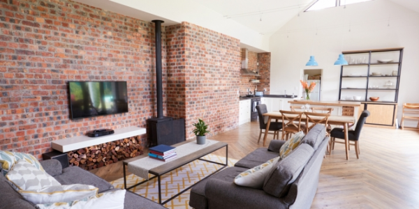 Dekorasi interior bata ekspos ruang keluarga dan dapur yang menyatu.