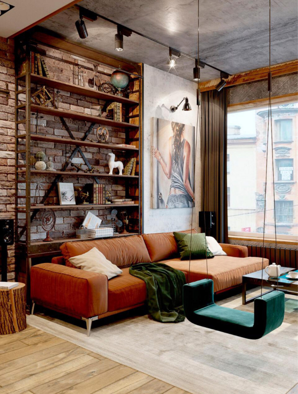 Ruang tamu bata ekspos dengan bangku gantung yang cantik nya.