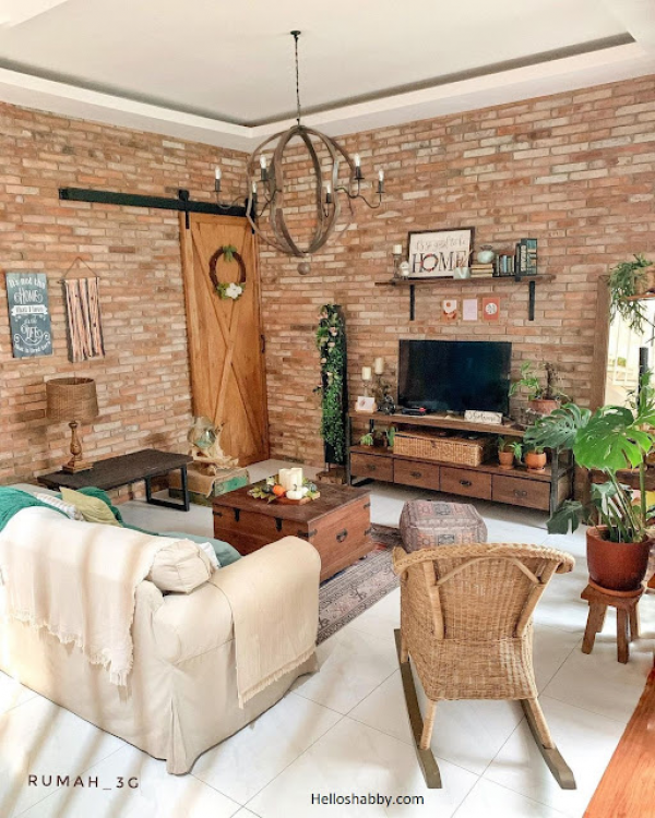Dekorasi ruang keluarga bata ekspos yang cantik sih ini.