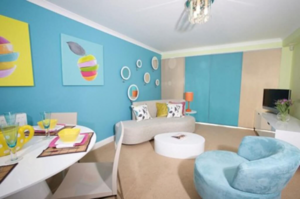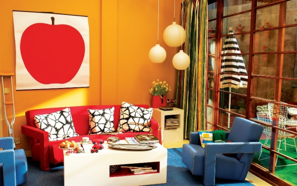 Interior ruang keluarga bergaya pop art dengan warna yang menarik ya moms.